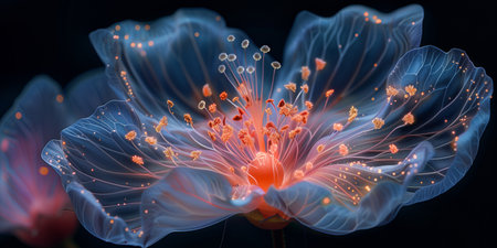An enchanting flower with glowing petals illuminated by vibrant radiant light, showcasing delicate structures in intricate details, evoking a sense of calm and wonder in nature.