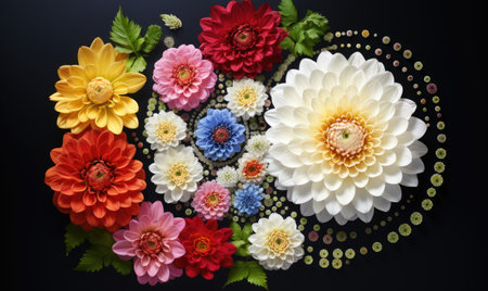 Colorful dahlia flowers on a dark background, top view