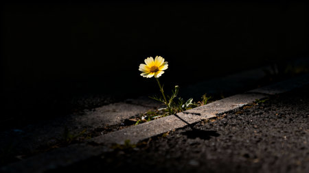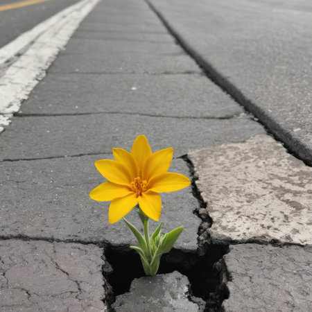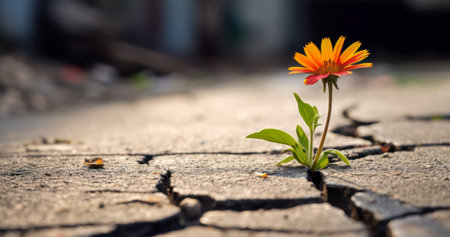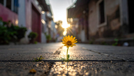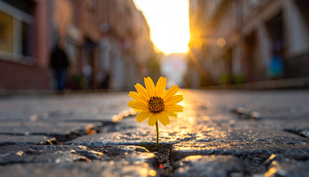 A vibrant yellow flower emerges through a crack in the pavement, illustrating resilience and hope amidst an urban backdrop with soft sunlight.