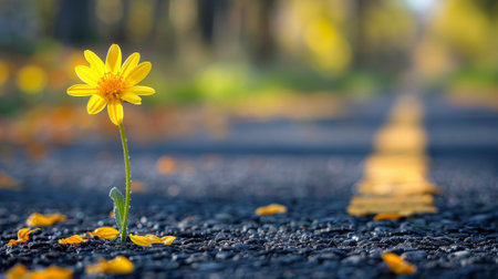 Yellow Flowers Symbolizing Resilience and Triumph Over Urban Asphalt Landscape, A Nature Harmony
