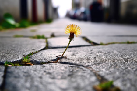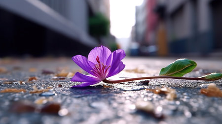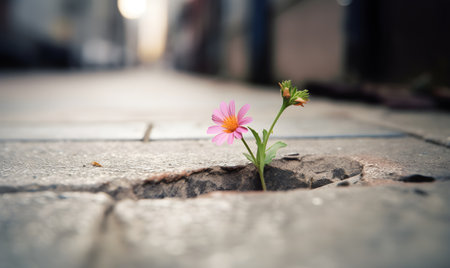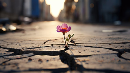In a city's heart, a small flower thrives on a cracked street, symbolizing resilience, Ai Generated.