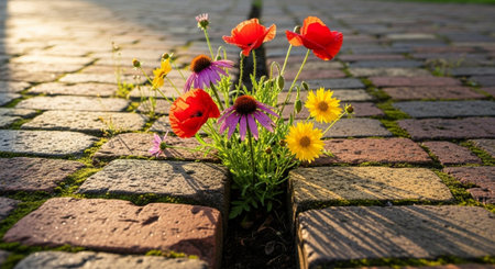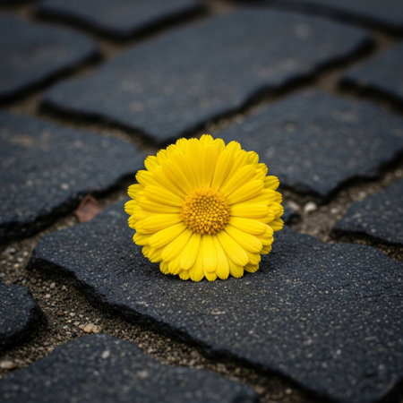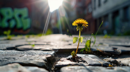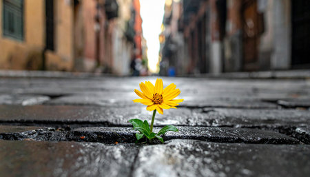 A vibrant yellow flower emerges from cracks in a cobblestone street, symbolizing resilience against urban decay. Sunlight filters through, highlighting its beauty.