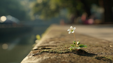 Small, white flower emerges from a crack in a concrete ledge, with out-of-focus background elements of nature and light.