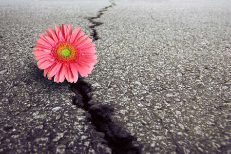 A brightly colored flower blooming in a cracked sidewalk, representing resilience and uniqueness