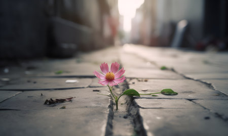 Pink flower on the crack in the concrete floor. Shallow depth of field. (AI Generated)