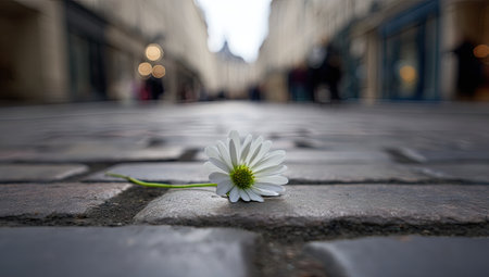 Single white daisy lies on a gray cobblestone street, in front of blurred city buildings.