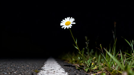 White daisy flower emerging from a crack in asphalt, representing resilience, growth, and hope in challenging conditions. Close-up with a blurred background.