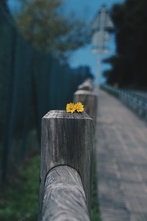 Yellow daisy on the road with shadow on the ground. Selective focus.
