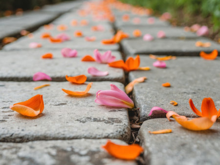 Vibrant Floral Carpet on Stone Street Creating a Lively Summer Mosaic Concept of Nature's Art, Colorful Walkways, Urban Gardening.