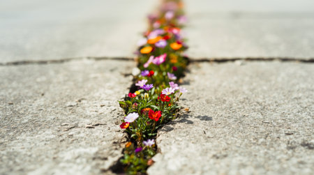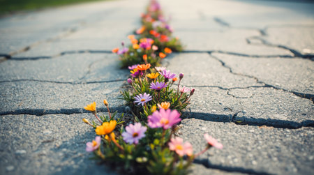 A burst of color in the gray asphalt with growing flowers Creating using generative AI tools
