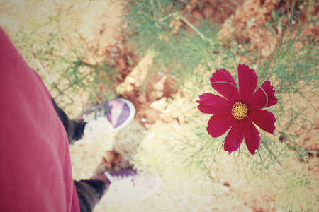 Blurry of flower on pavement in park and person sitting beside it with bokeh texture abstract background. One thinking, chill, chilling, relaxing, introvert personality, picnicing lifestyle concept.