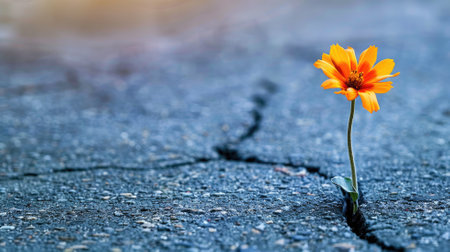 Single orange flower blooms through crack in asphalt, symbolizing resilience