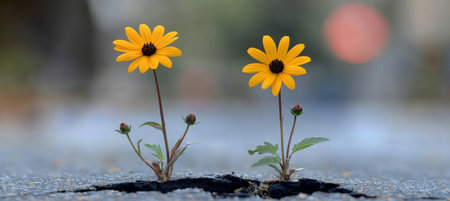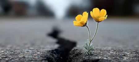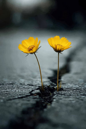 Symbolic Resilience of Nature Two Bright Yellow Flowers Breaking Through Asphalt, Defying Hardship