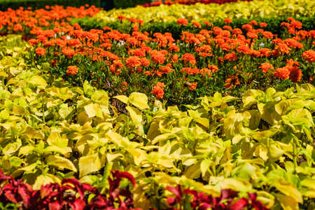Flower bed with marigolds in an urban environment. Background with selective focus and copy space for text