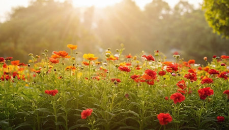 Vibrant flowerbed with colorful blossoms in soft sunlight