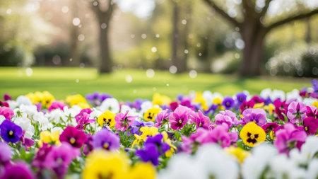 A vibrant bed of multi-colored pansy flowers in a park setting with soft sunlight filtering through trees and...