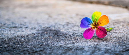 A vibrant rainbow colored flower blooms from concrete, symbolizing hope and growth. This captures essence of rights activism and