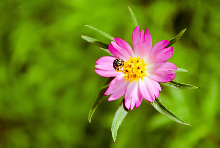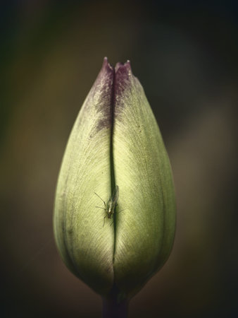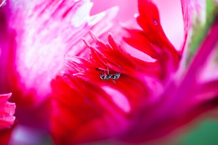Tiny insect on the petal of the pink tulip flower. Close up.