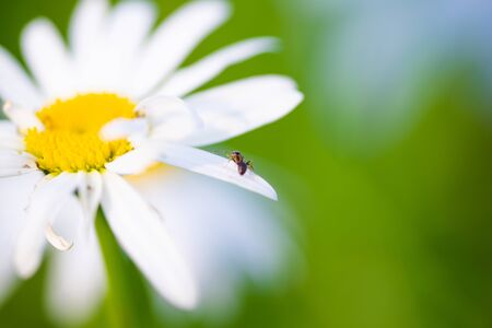 Close-up macro image shot of bee on beautiful fairy dreamy magic white daisy flower with dark green leaves, retro vintage color, soft selective focus, copyspace for text