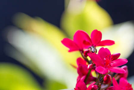 Giant red bug insects is climbing flowers of blooming weeds. After the rain and dew in the morning