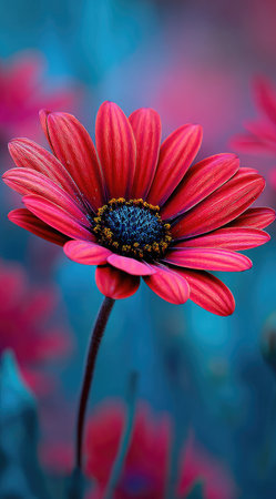 A close-up photograph features a striking red daisy in full bloom, with a dark blue center. The petals display a textured quality, set against a soft, blurred background of blue and pink hues. The image showcases natural lighting and composition suitable for decorative or editorial projects.