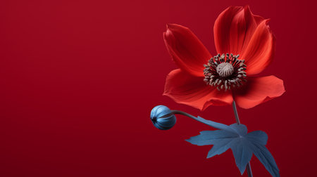 A striking red flower stands out against a bright blue background, capturing the essence of nature's artistry with its delicate petals and lush green leaves.