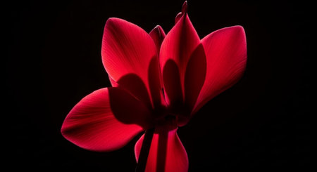 Close-up image of a vibrant red flower, set against a dark background with intricate details of the petals and leaves. The lighting emphasizes the flower's color and creates a dramatic mood.