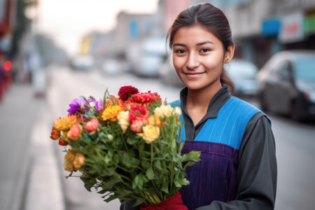 a cropped shot of a young woman selling flowers on the streets, created with generative ai