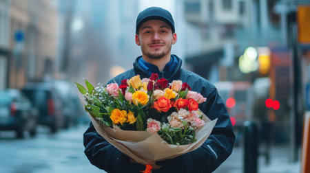 A confident courier stands on a busy city street, showing a vibrant bouquet of beautiful flowers in a neat uniform.