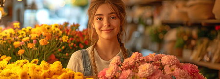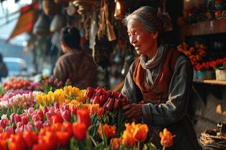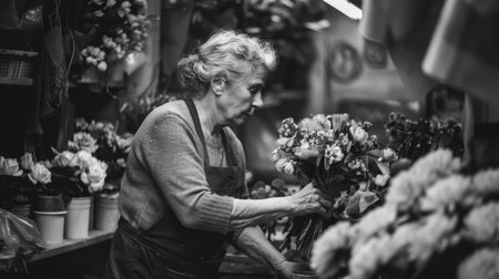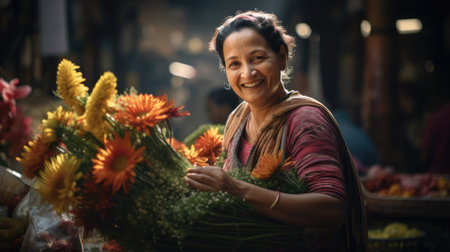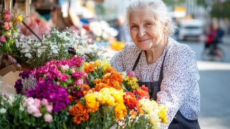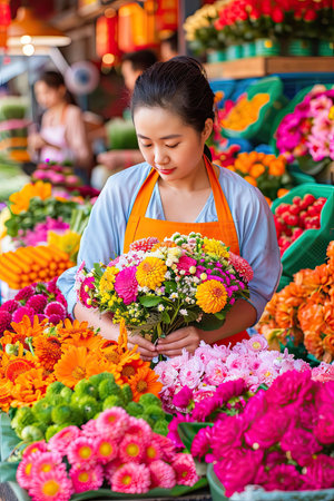 A flower vendor arranges a vibrant bouquet, surrounded by an array of colorful blooms. Generative AI