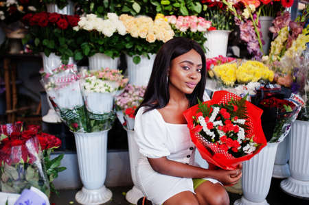 Beautiful african american girl in tender white dress with bouquet flowers in hands standing against floral background in flower shop.Black female florist.