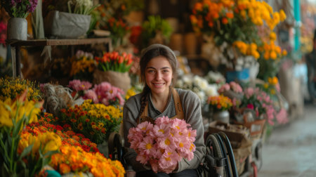 An inspiring image capturing a young woman in a wheelchair, joyfully holding a bouquet of pink flowers amidst a colorful flower market.