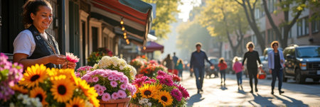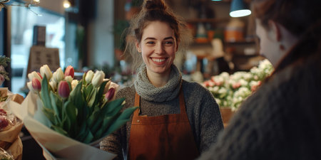 A female flower seller assists a customer in crafting a fresh bouquet in a brightly lit shop, surrounded by colorful blossoms and a warm, welcoming atmosphere, banner