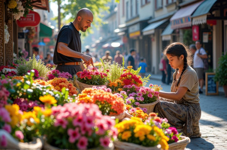 A flower vendor arranging a bouquet of fresh roses and daisies in bright colors, with passersby browsing other colorful flower displays.