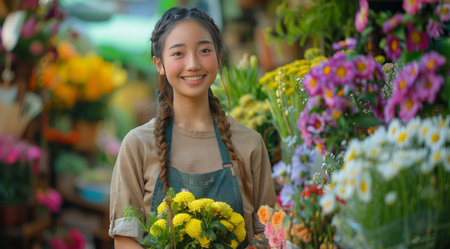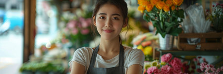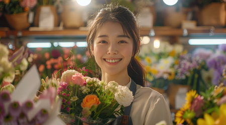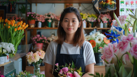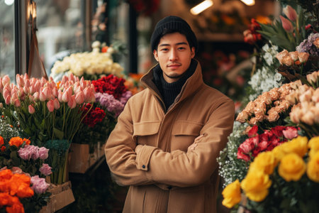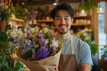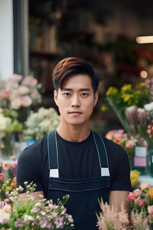 A Asian entrepreneur infusing his diverse cultural influences into his floral business, offering a fusion of traditional and contemporary floral designs that reflect the richness and diversity of his heritage, captivating customers with his unique style and vision.