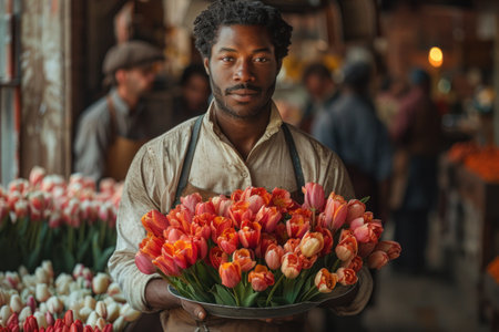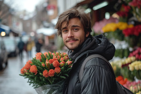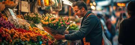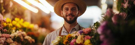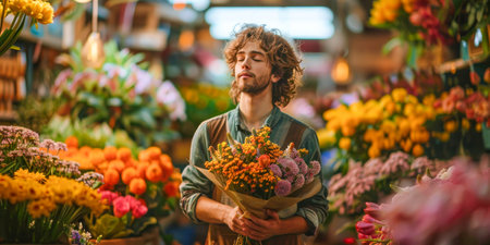 Young male florist lovingly holds a vibrant bouquet, surrounded by a variety of fresh flowers in a lively market scene