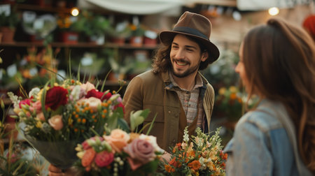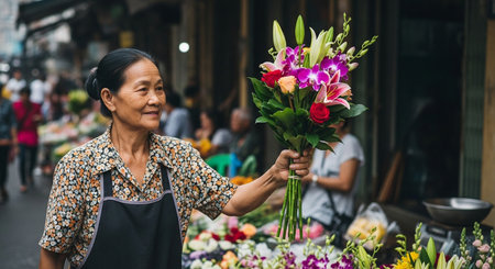 In a vibrant market a vendor graciously offers a bouquet of flowers to a cherished customer