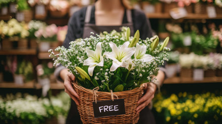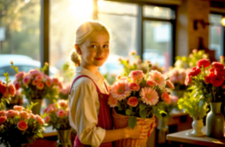 Inside a flower shop, a cheerful girl holds a basket full of pink flowers, surrounded by vibrant arrangements bathed in golden light.