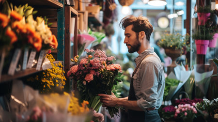 Thoughtful Male Florist Arranging Colorful Bouquets in Vibrant Flower Shop, Small Business Owner