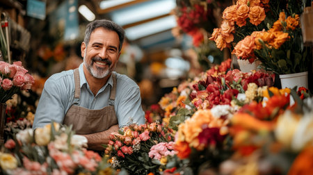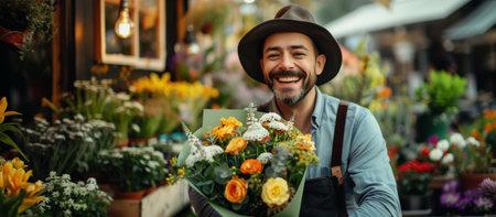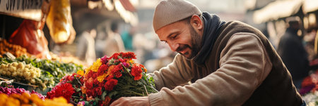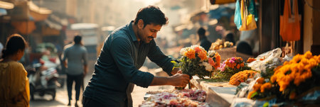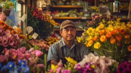 A Latino flower vendor showing his colorful blooms at a bustling street market, his charismatic personality and artistic flair drawing admirers who appreciate the beauty and freshness of his handpicked flowers.