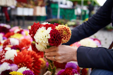 Woman shopping for flowers at the farmers market in autumn