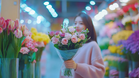..Florist arranging bouquet in flower shop for 8th March and Mother's Day gifts, festive, vibrant, celebration