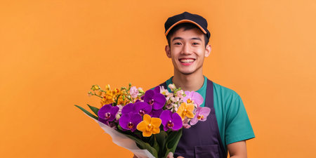 Young florist smiling and holding a vibrant bouquet of orchids, ready for valentine's day delivery