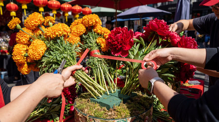 Hands meticulously arrange vibrant orange marigolds and deep red peonies into bouquets. An outdoor market, featuring red lanterns and sunny ambiance, serves as the backdrop for cutting stems.