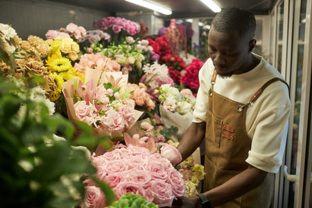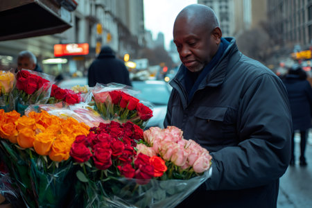 African American street vendor choosing a bouquet of colorful roses at his flower stand in a big city