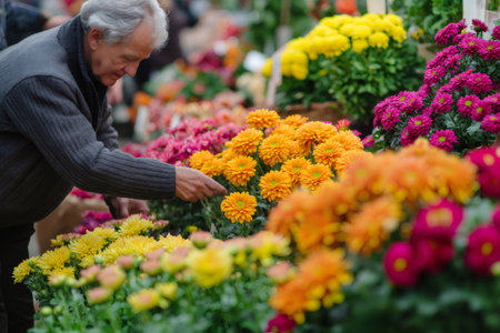 Senior gardener taking care of colorful chrysanthemum flowers in pots at a flower market or greenhouse