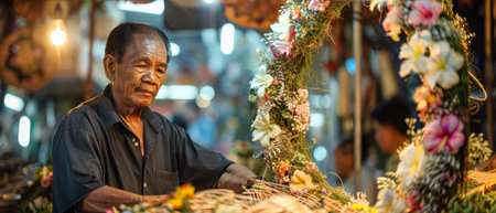 Artisan, expertly weaving a floral wreath, showcasing intricate craftsmanship at a bustling marketplace Photography, Backlights, Depth of Field Bokeh Effect, Lowangle view