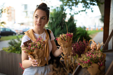cute young woman holding her favorite flowers in a street garden shop
