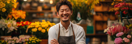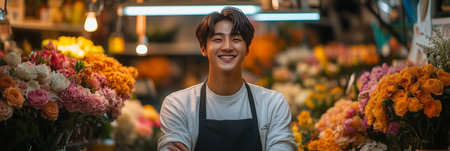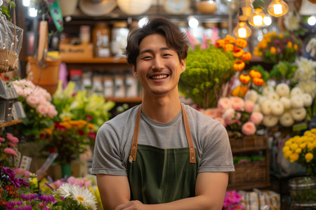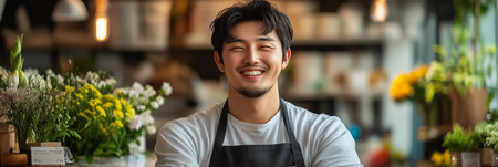 Asian man in apron smiling with confidence in flower shop.