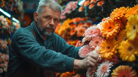 A vendor carefully arranges colorful gerbera daisies in a bustling flower market.